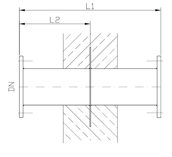 einseitig dichtend, zur Durchführung eines glatten Rohres und für die Dehnungsaufnahme der Rohrleitung, mittig aufgeschweißtem Mauerflansch und hinterschweißten Hutmuttern • Glattflansche ähnlich DIN 2576 red. Blattstärke (alternativ volle Blattstärke) gebohrt nach PN 10/16* • Vorschweißflansche DIN 2632-35 • Flansche nach EN 1092-1:2001 (D) nach Typ 01, 02, 11