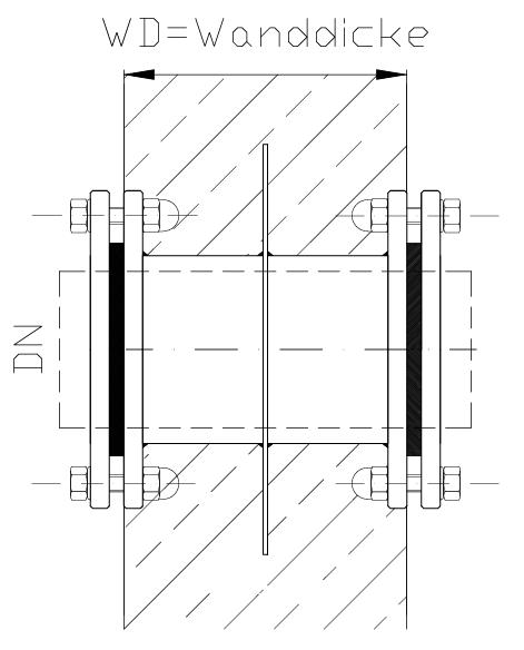 beidseitig dichtend, zur Durchführung eines glatten Rohres und für die Dehnungsaufnahme der Rohrleitung, mittig aufgeschweißtem Mauerflansch und hinterschweißten Hutmuttern • Glattflansche ähnlich DIN 2576 red. Blattstärke (alternativ volle Blattstärke) gebohrt nach PN 10/16* • Vorschweißflansche DIN 2632-35 • Flansche nach EN 1092-1:2001 (D) nach Typ 01, 02, 11