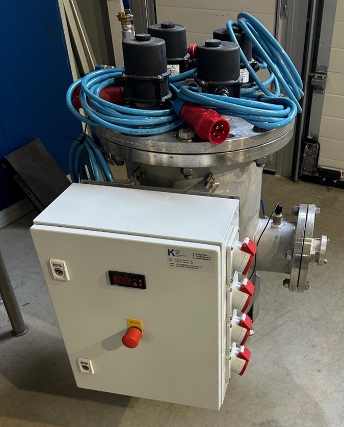 Diese besitzt 2 Hydraulische Anschlüsse DN150 (alternativ Adaption auf C-Kupplung) und einen angebauten Schaltschrank mit integrierter Temperaturregelung.